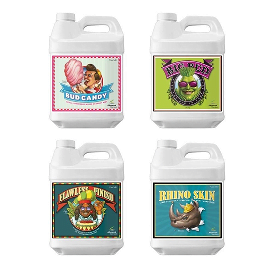 1 grow micro bloom de 500ml + 1 big bud 250ml, 1 bud candy 250ml, 1 rhino skin 250ml y 1 flawless finish 250ml.
