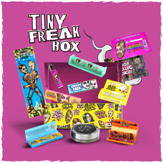 El Tiny Freak Box de Lion Rolling Circus reúne una selección compacta de accesorios esenciales para un armado práctico y ordenado. Combina papeles clásicos, saborizados y transparentes, junto con un hemp wrap, grinder metálico, máquina de armar y un Clipper oficial.