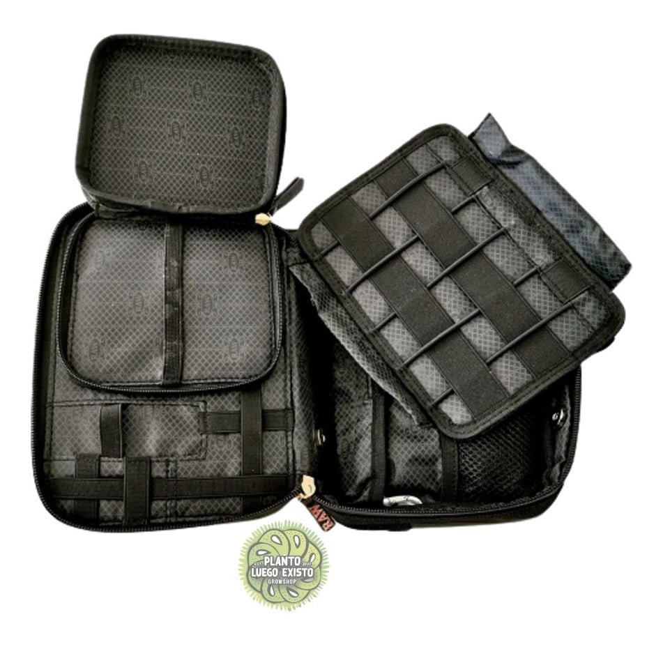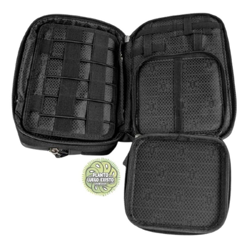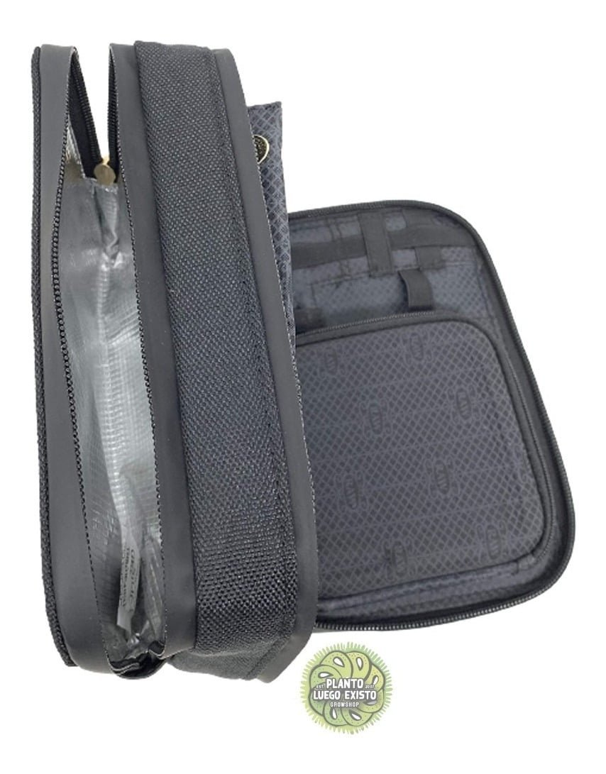 CARACTERÍSTICAS: 6 capas de tela Prueba de olor Resistente al agua Cartera con forro de aluminio Correas cruzadas y sección de cordón. Sección central extraíble (sujeta por 4 cierres magnéticos) Área de cremallera rígida para tus pre-roll.
