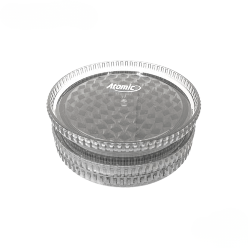 🌀 Picador Atomic plástico 90 mm — grinder de color transparente 🍭 en 3 partes con rejilla y contenedor para polvillo. Fácil de usar, desmontar y limpiar para picar flores y hierbas.