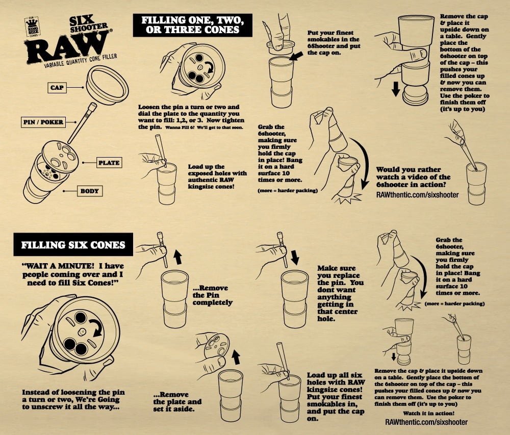 - Raw Six Shooter Nunca fue tan sencillo prerarar conos raw con tus hierbas favoritas. Nuevo Raw Six Shooter diseñado para armar 1,2,3 o 6 conos al mismo tiempo. Has de utilizar los conos 1 1/4 para rellenar de una forma comoda y sencilla. En menos de 1 minuto tendras listos hasta 6 conos, ademas puedes utilizar el Raw Six Shooter para guardar los conos que hayas armado.