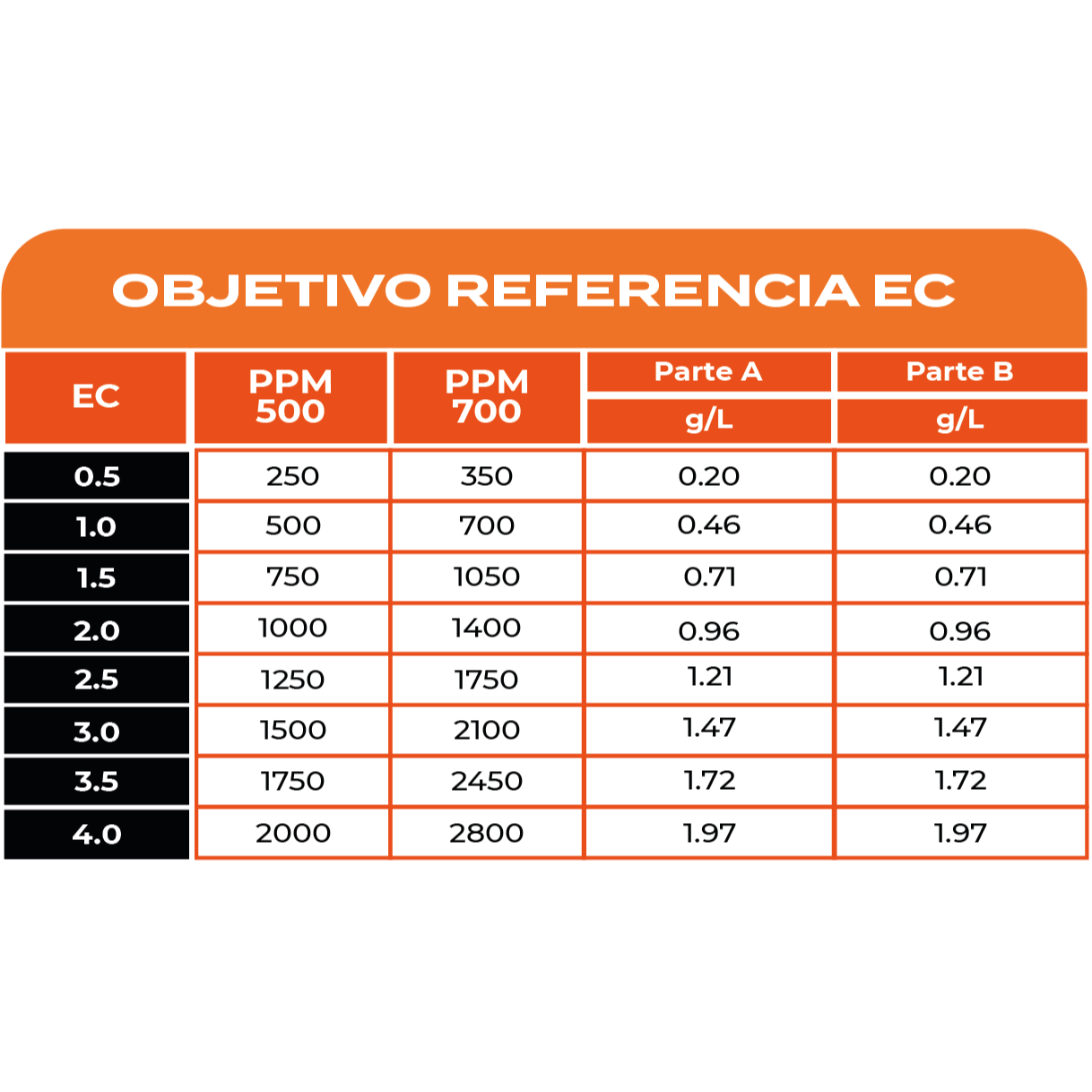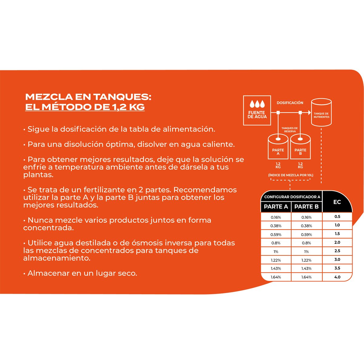 La división del fertilizante en dos partes, A y B, es una característica fundamental que asegura una absorción óptima de todos los nutrientes por parte de las plantas. De esta manera, se evitan deficiencias y se garantiza un desarrollo saludable y vigoroso de los ejemplares.