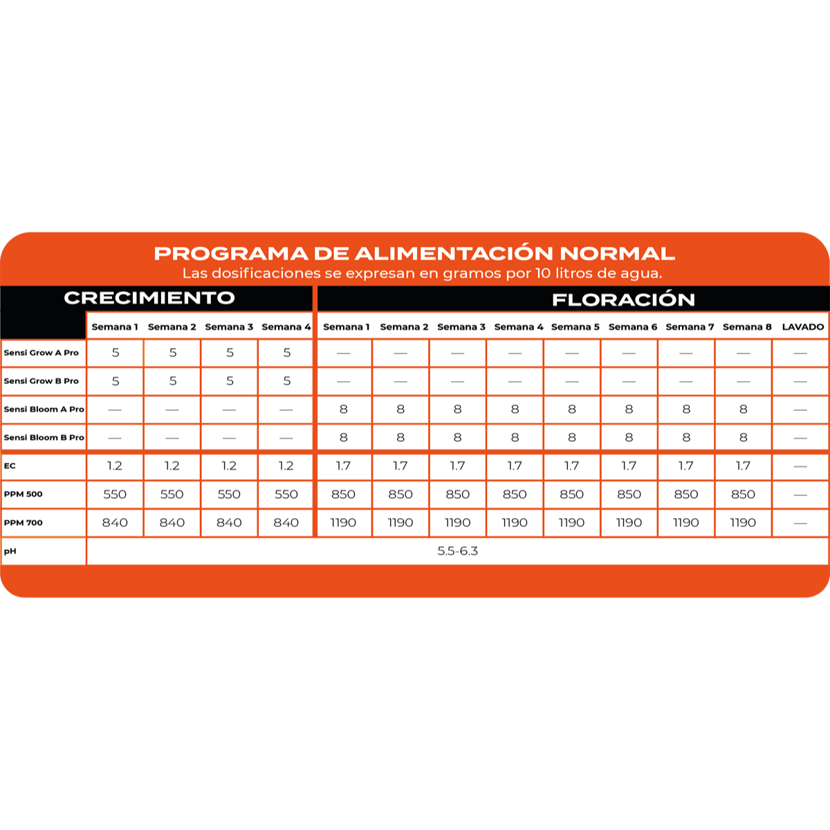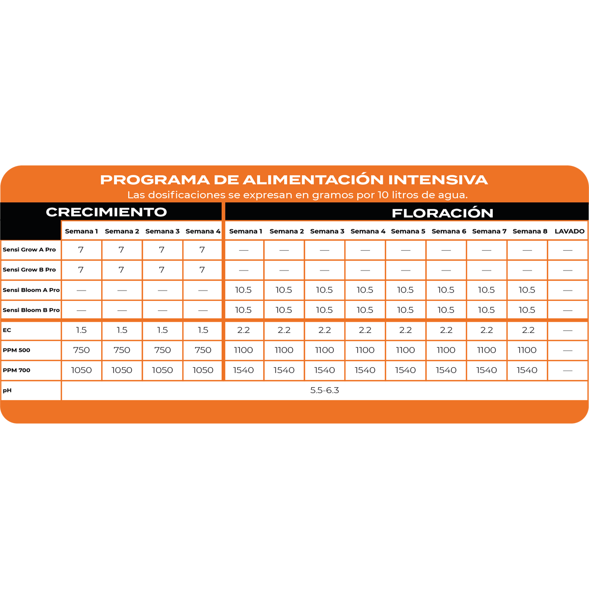 Sensi Bloom B: Entre 8 y 10.5 gramos por cada 10 litros de agua: