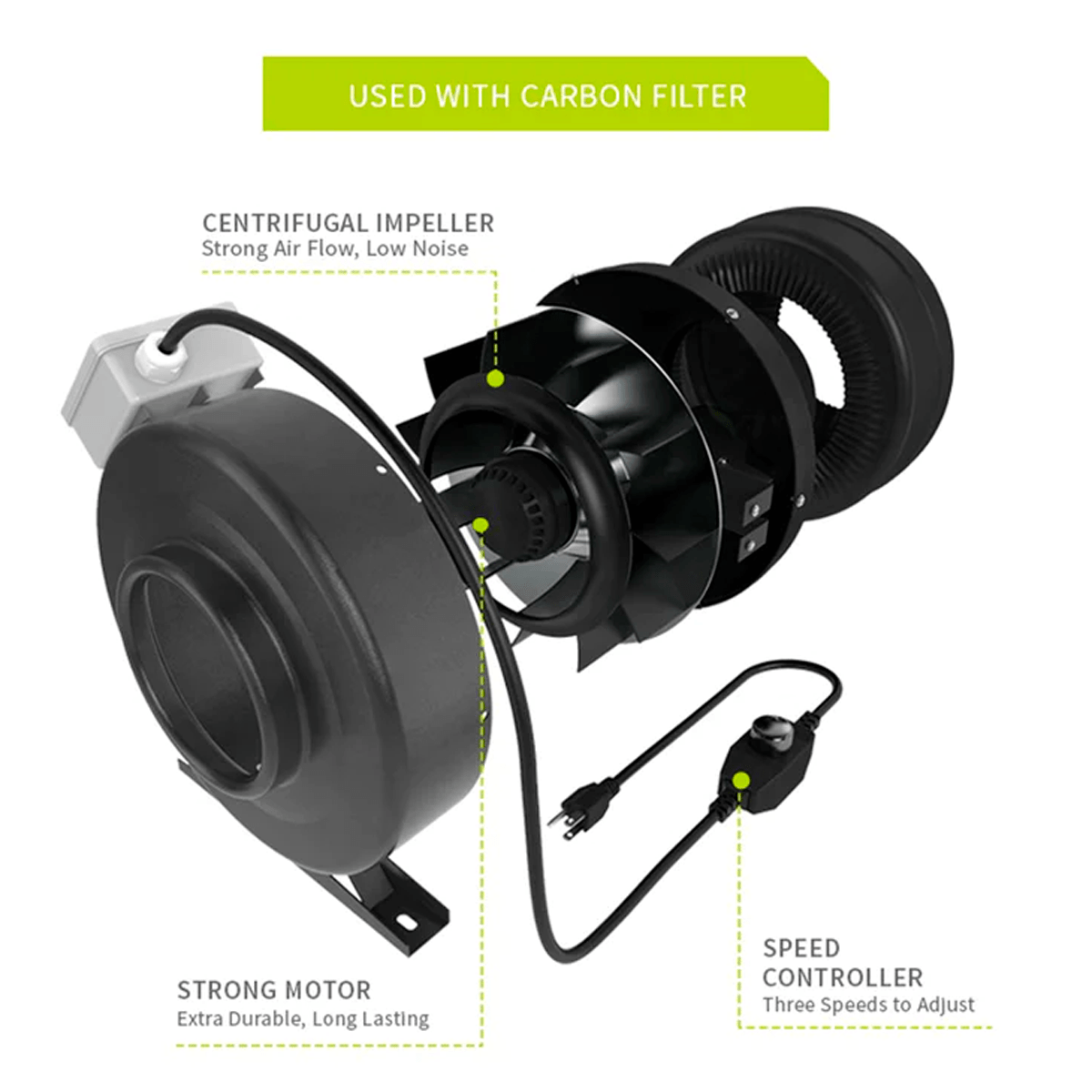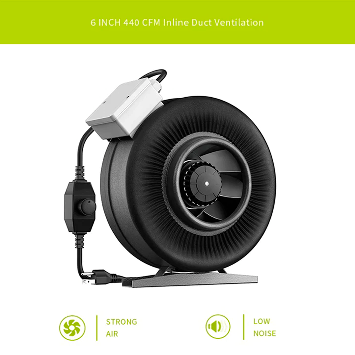 Ventilación Silenciosa Esta turbina de 6 pulgadas posee 2450 Revoluciones por minuto logrando 440CFM (690m3/h) con una potencia de 135watts y una corriente de 1.1 amp, la misma también es bastante liviana en relacion a su gran potencia ya que cuenta con un peso de 3.96kg.